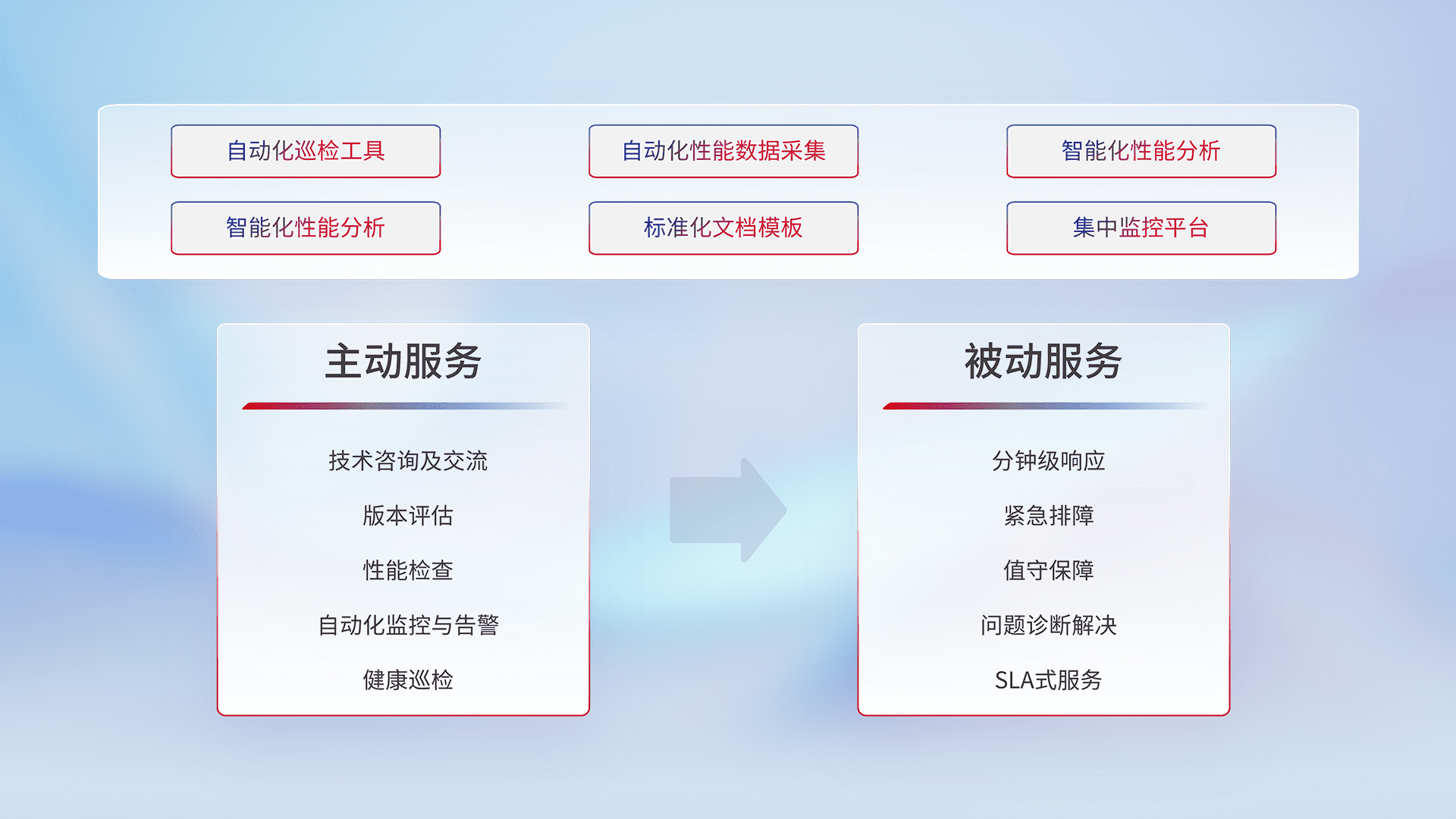 智能化工具和标准化文档,,保障服务质量,,提供主动服务(包含技术咨询、、、、版本评估、、、、性能检查、、、自动化监控与告警、、、、健康巡检)和被动服务包含(分钟级响应、、、、紧急排障、、、值守保障、、问题诊断解决、、、SLA服务)。。。。